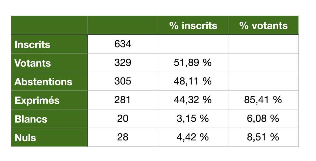 La liste VIVRE ENTRE VIGNES ET FORÊT conduite par Éric GIRARDIN obtient 281 voix (44,32 % des inscrits) et donc 15 sièges au Conseil Municipal.